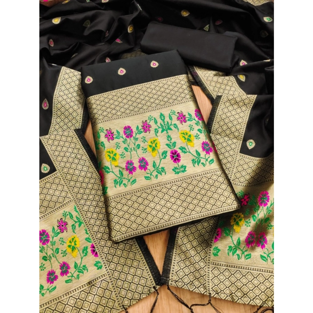 Generic Women’s Banarasi Silk Printed Unstitched Salwar Suit Material With Dupatta (Black, 3Mtrs)