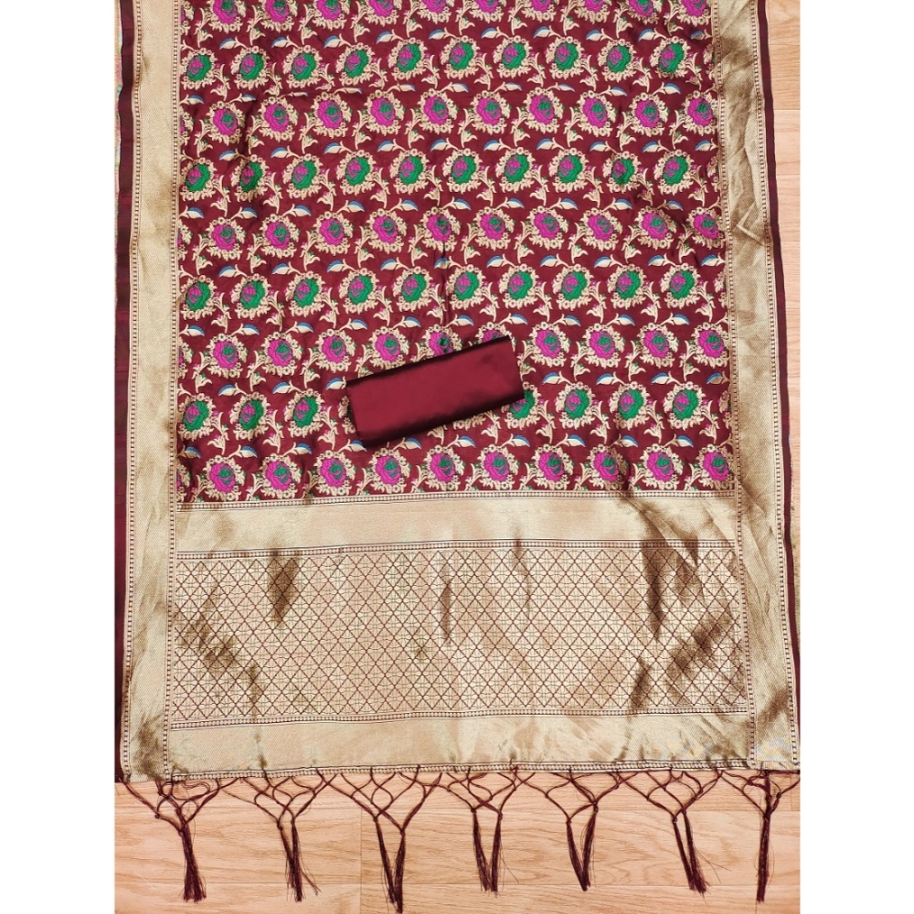 Generic Women’s Banarasi Silk Printed Unstitched Salwar Suit Material With Dupatta (Maroon, 3Mtrs)
