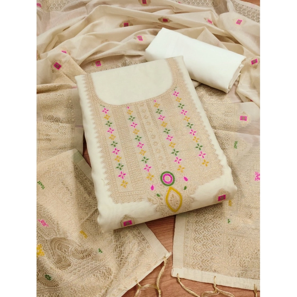 Generic Women’s Banarasi Silk Printed Unstitched Salwar Suit Material With Dupatta (White, 3Mtrs)
