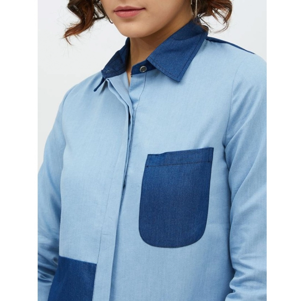 Generic Women’s Denim Patch Work Long Sleeves Standard Length Shirt (Blue)