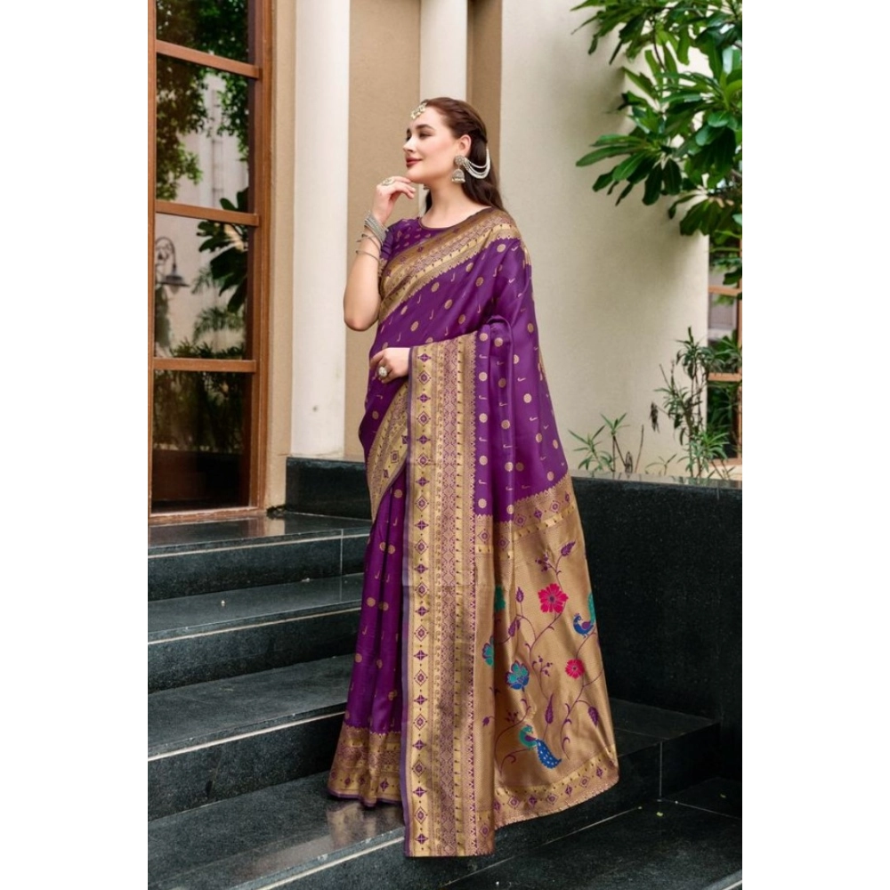 Generic Women’s Silk Blend Paithani Weaving Saree With Unstitched Blouse 5.5Mtr (Purple)